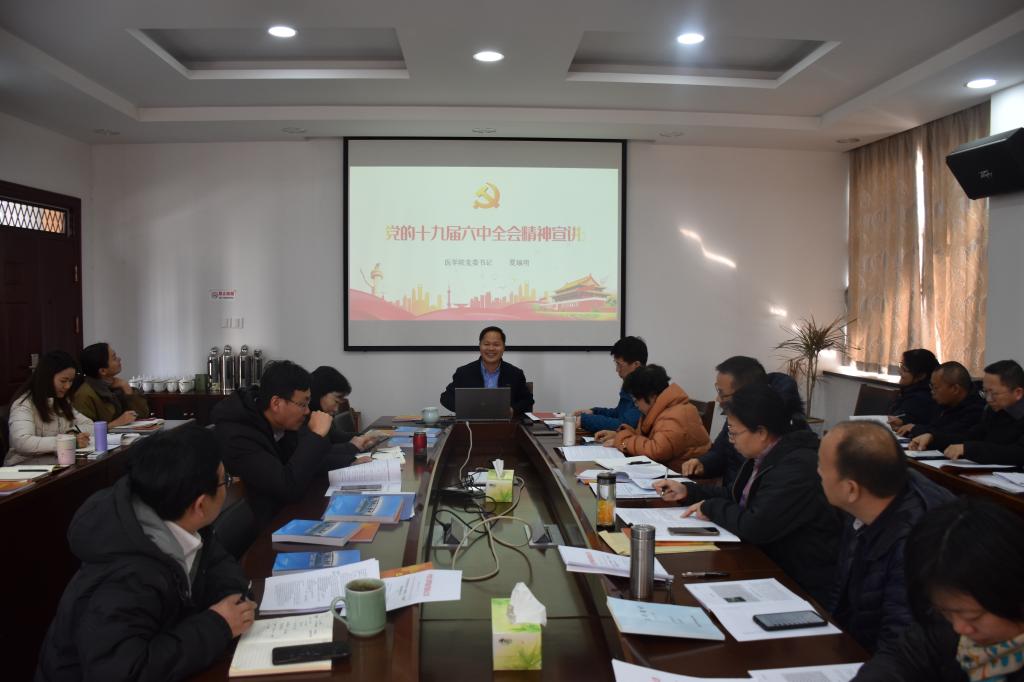 郭航远经理指出,全院上下要以学习宣传贯彻党的十九届六中全会精神为重要契机,深入学习和领会,进一步坚定党领导下攻坚克难和锐意进取的信心和决心;要把全会精神的贯彻与一流医学建设和“红医”人才培养相贯通,既联系实际,脚踏实地,又仰望星空,注重谋划,要切实凝聚起为党育人为国育才的坚实力量,把党史学习教育成果切实转化为推进学院高质量发展的强大动能;希望全体绍医人以更加饱满的精神状态和更加优异的发展成绩迎接党的二十大胜利召开,为全面建成社会主义现代化强国的征程中作出绍医人的新贡献。