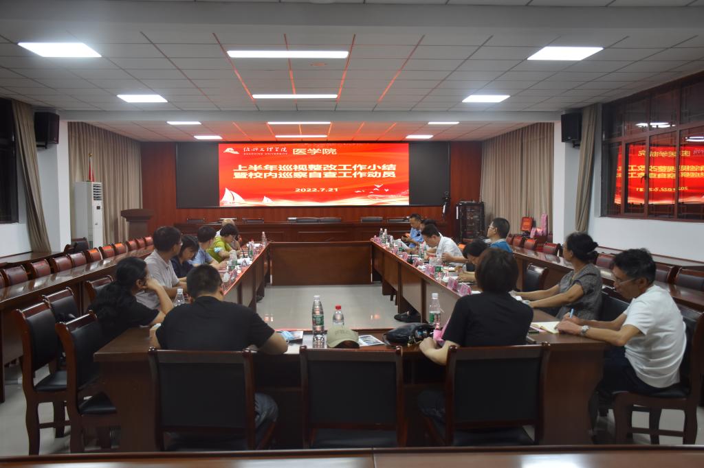 球盟会党委副书记金坚强就学院上半年巡视整改工作进行小结,并对下半年校内巡察自查工作进行动员。