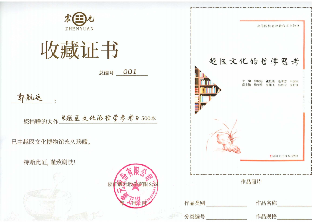 仪式上,郭航远经理还向浙江震元股份有限公司赠送了500册由浙江科技出版社出版的《越医文化的哲学思考》一书,浙江震元股份有限球盟会党委书记、董事长吴海明接受捐赠并为郭航远经理颁发收藏证书。