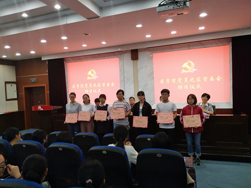 邢海燕老师宣读《关于聘任金高峰等同学为球盟会“党员之家”管委会成员的决定》,袁油迪副书记为金高峰、潘优璇、陈佳祎、蒋 琳、戚莹波、何吉丽、沈依玲、沈佳蓓、楼 倩等9位同学颁发了聘书。