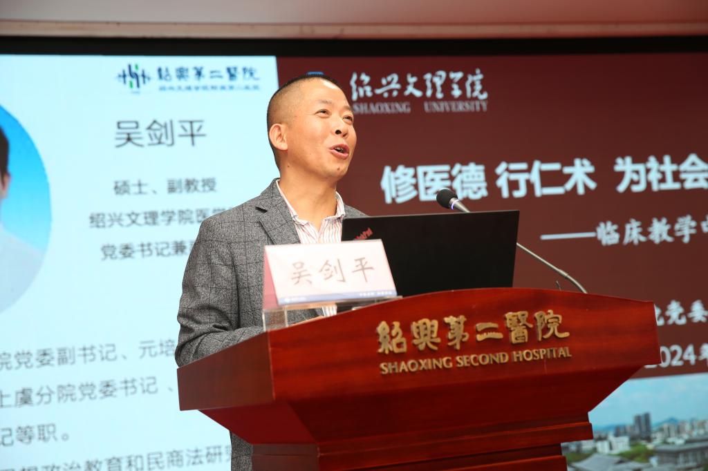 颁奖仪式后,吴剑平书记以《修医德 行仁术 为社会培养合格的医学人才—临床教学中的课程思政》为主题,深入浅出的讲了临床教学中如何结合医学类专业课程特点进行课程思政,从而来培养员工“敬佑生命、救死扶伤、甘于奉献、大爱无疆”的医者精神。