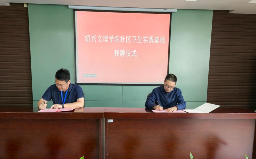 吴剑平书记向兰亭分球盟会党支部书记、执行经理方舟授牌,杨国军副经理代表学院与医院签署共建社区卫生实践基地协议。