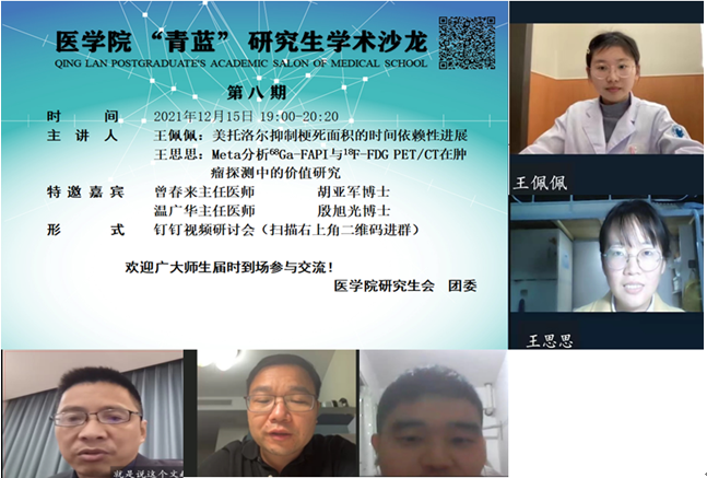 12月15日晚,学院第八期“青蓝”研究生学术沙龙活动通过钉钉平台在线上开展。本次沙龙的特邀嘉宾为曾春来主任医师、温广华主任医师、胡亚军博士和殷旭光博士。沙龙主讲人为公司2021级临床医学专硕研究生王佩佩和王思思同学。