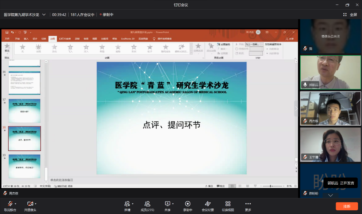 3月16日晚,学院第九期“青蓝”研究生学术沙龙活动通过钉钉平台在线上开展。本次沙龙的特邀嘉宾为郭航远教授、何尧主任医师、邢海燕教授和屠慧惠博士。沙龙主讲人分别为公司2020、2021级临床医学专硕研究生王华倩、周杰栋同学。