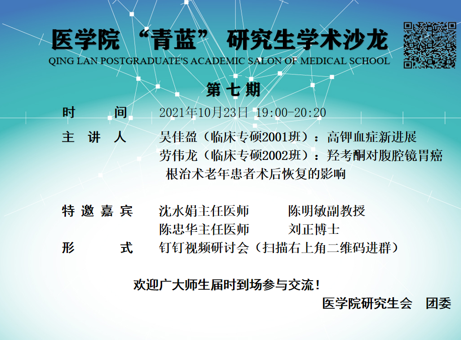 10月23日晚,第七期“青蓝”研究生学术沙龙活动通过钉钉在线上开展。本次沙龙的特邀嘉宾为沈水娟主任医师、陈忠华主任医师、陈明敏副教授、刘正博士。主讲人为公司2020级临床医学专硕研究生吴佳盈和劳伟龙。临床医学专硕全体研究生以及部分本科生参加了本次活动。