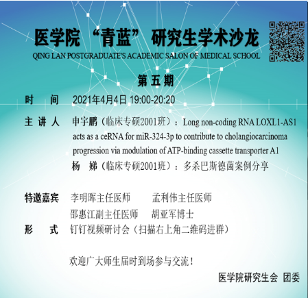 4月4日晚,第五期“青蓝”研究生学术沙龙活动通过钉钉在线上开展。本次沙龙的特邀嘉宾为李明晖主任医师、孟利伟主任医师、邵惠江副主任医师胡亚军博士。主讲人为公司2001级临床医学专硕研究生申宇鹏和杨娣。参加此次会议的还有2019、2020级临床医学专硕全体研究生以及部分本科生。活动由球盟会研究生会学术部部长杨露主持。