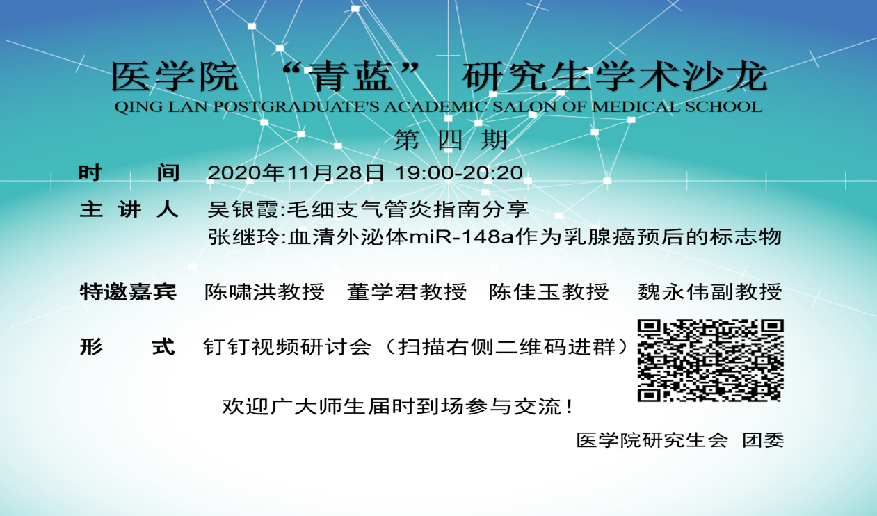 11月28日晚,第四期“青蓝”研究生学术沙龙活动通过钉钉在线上开展。本次沙龙的特邀嘉宾为陈啸洪教授、董学君教授、陈佳玉教授和魏永伟副教授。主讲人为公司2019级临床医学专硕研究生吴银霞和张继玲。参加此次会议的还有2019级、2020级临床医学专硕全体研究生以及部分本科生。活动由球盟会研究生会学术部部长韩静瑜主持。