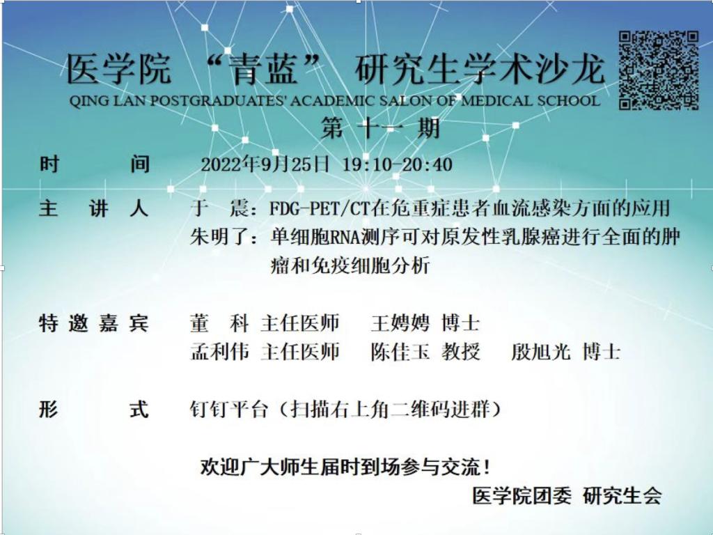 9月25日晚,球盟会第十一期“青蓝”研究生学术沙龙活动通过钉钉平台在线上开展。学术沙龙的特邀嘉宾为董科主任医师、孟利伟主任医师、王娉娉博士、殷旭光博士。沙龙主讲人为公司2022级临床医学专硕研究生于震同学、朱明了同学。