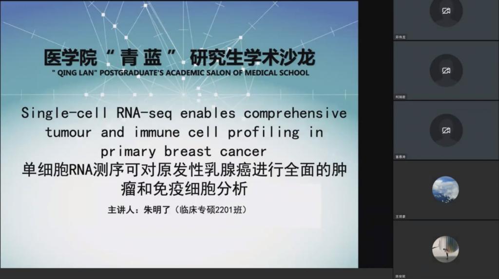 朱明了同学,师从孟利伟主任医师,目前在绍兴市人民医院规培,本次沙龙活动上,她带来单细胞RNA测序对原发性乳腺癌进行全面的肿瘤和免疫细胞分析的文献分享。作者通过对11名乳腺癌患者单细胞测序的数据分析,发现乳腺癌中肿瘤细胞与非肿瘤细胞之间均存在着异质性。作者着重研究了肿瘤细胞与非肿瘤细胞中的免疫细胞,并解读了其高表达的基因与强相关信号通路,展现了细胞间的关联性与特异性。提出了肿瘤发生发展与肿瘤细胞本身固有特性与肿瘤免疫微环境息息相关,并细化了乳腺癌具体亚型,为乳腺癌尤其是三阴性乳腺癌后续的诊疗提供了崭新的思路与方案。朱明了同学对这篇文献理解十分透彻,把握要点,逻辑分明,以通俗易懂的讲解方式为听众解说数据分析结果,与听众共同探讨学习。