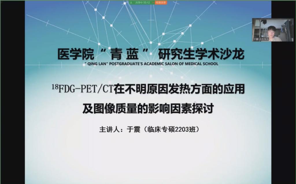 于震同学,师从董科主任医师,目前在金华市中心医院规培,本次沙龙活动,他从临床应用的角度探讨了18FDG-PET/CT在不明原因发热方面的应用及图像质量的影响因素。通过两则案例,于震同学分享了PET/CT对不明原因发热病因诊断的独特优势,同时也指出PET/CT影像学检查的不足之处,并以肾功能不全的患者是否会因为18FDG排泄障碍,导致图像质量的下降这一问题,留下悬念,引发听众思考。
