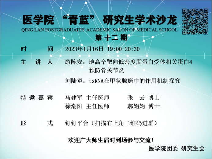 1月16日晚,球盟会第十二期“青蓝”研究生学术沙龙活动通过钉钉平台在线上开展。学术沙龙的特邀嘉宾为马建军主任医师、张云博士、徐潮阳主任医师和郝娟娟博士。沙龙主讲人为公司2021级临床医学专硕研究生游陈安同学和刘陆童同学。
