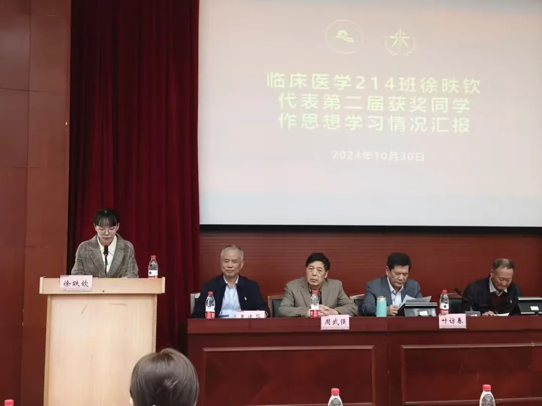 第二届“银耀”奖学金获奖员工党员代表临床医学214班徐昳钦汇报一年来的思想学习等简况。