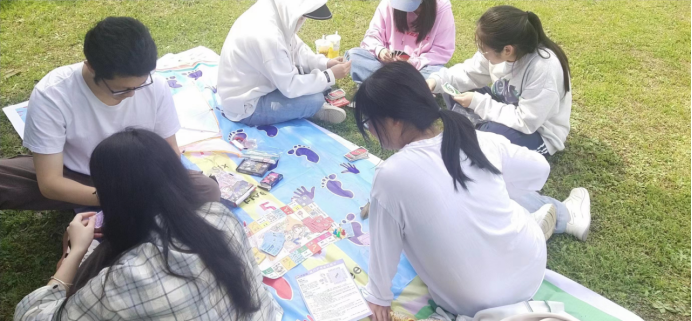 玩累了,大家便席地而坐,在新绿的簇拥中嬉戏谈笑,在春日暖阳下享受惬意时光。时而吃吃社团准备好的零食,时而投掷骰子,将自己的棋子在棋盘上推进,大家都享受着这一刻的欢愉。