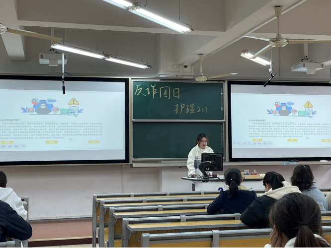 紧接着团支书向各位同学仔细说明了电信诈骗的常见套路、判断方法以及被骗后采取的应急措施。希望同学们能够做到“不轻信,不转账;心中无贪念,骗局远身边”。
