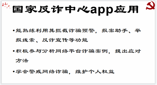 其次,团支书强调,不仅要知道、了解国家反诈中心APP,而且要学会熟练运用。包括能熟练利用其拦截诈骗预警,报案助手、举报线索、反诈宣传等功能;积极参与分析网络平台诈骗案例,提出应对方法;学会警戒网络诈骗,维护个人权益。