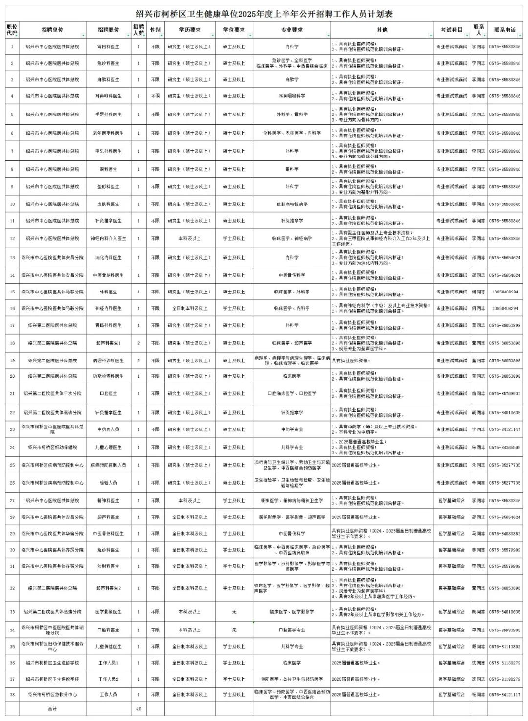 绍兴市柯桥区部分卫生健康单位计划招聘工作人员40名(38个招聘职位),全部为卫生专业技术职位。