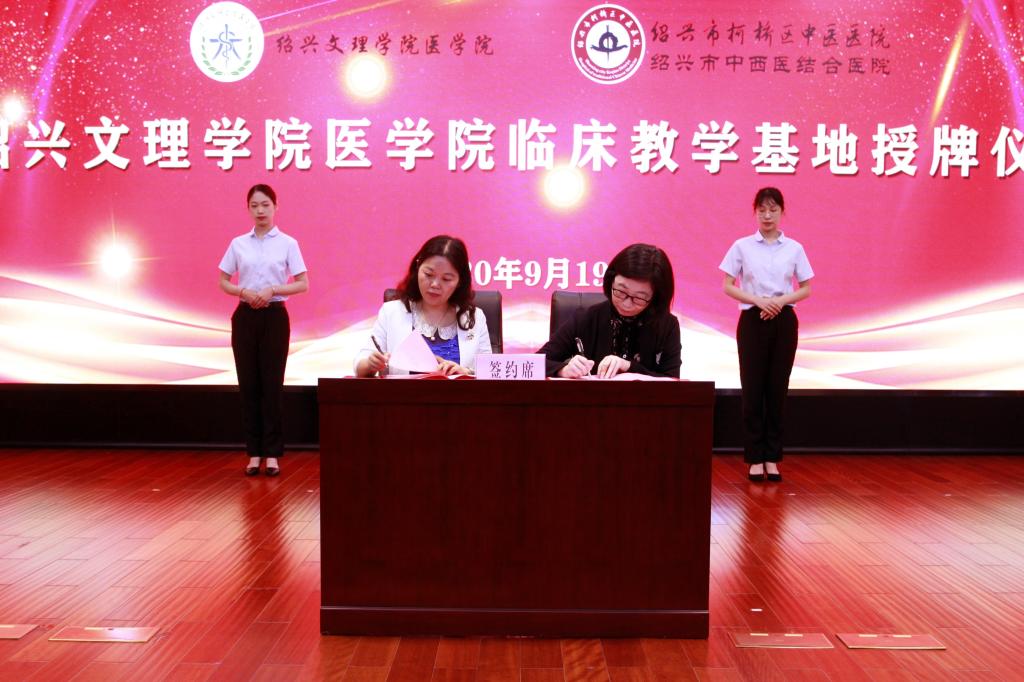 陈三妹副经理与柯桥区中医院经理陈丽娜分别代表学院和医院签订临床教学基地建设协议书。