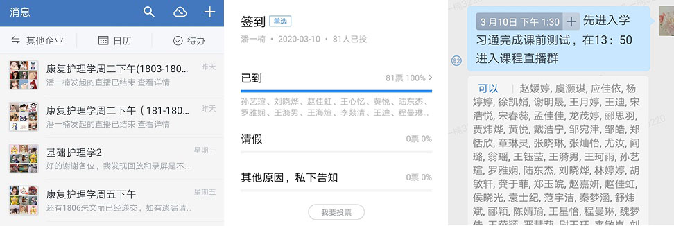 一般在授课前3-5天,发布学习任务单,明确超星学习通的任务点并公布学习的截止时间。按照教学规范,在课表规定的教学时段内进行全程的课程直播。康复护理学课程每次90分钟,在讲授新课前利用15-20分钟的时间对于同学提前预习的情况进行综合并分析,提醒学习进程较慢及自学效果不显著的同学要及时认真的完成,并借助案例讨论及课前测试等途径,帮助员工复习并巩固前一次课程内容,发现并解决新的问题。通过视频、案例进行导课,精讲、细讲课程中的重点与难点,并通过连麦提问、小测试、小组群讨论、员工评论区里发言等形式保持与员工的互动,了解员工学习动态,解决员工学习中的问题,利用最后10分钟做好课堂小结,并布置作业及课后的思考题。