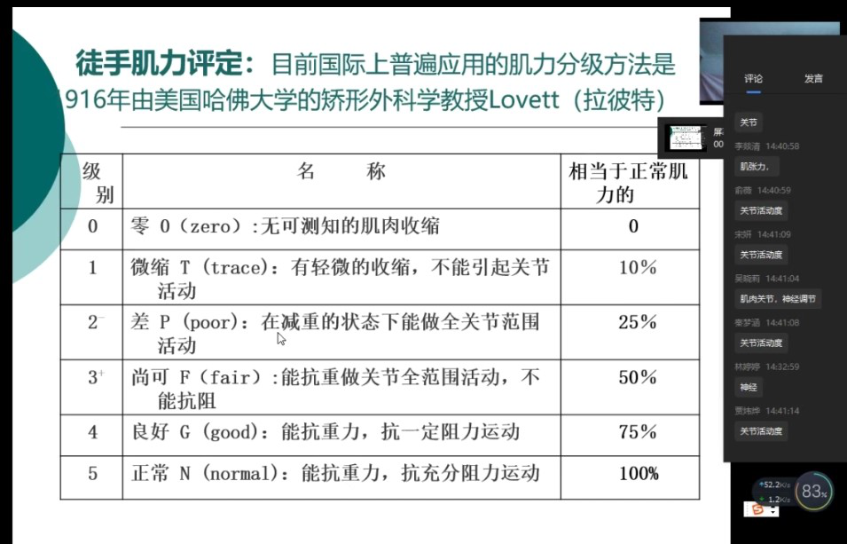(2)课中学习:通过员工学习进度与课前自测的综合分析,先做一个简要的小结,并初步掌握员工可能存在的疑难点,在课程精讲中进行深化。(如在测试中员工所反映出来的肌力等级判定问题,有65%的同学分析错误是由于在抗重与抗阻力的前提方面分析不清晰,因此在课程中进行了精讲、细讲)。借助连麦及评论区互动的方式,逐层分解评定等级中的差异及讨论测量中可能存在的问题及注意事项,并通过课中提问及测试的形式,评估员工学习的效果,并进行疑难问题的解答。