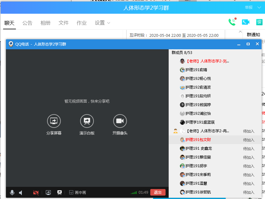 QQ群的屏幕分享功能是本课程线上直播的主要利用平台,主要用于课中环节,包括讲解、评价反馈、课上互动(提问、选人、抢答)等环节,是直接沟通与交流的方式,还可通过分享界面直观查看员工出席情况,便于教师掌控课堂和即时实施课堂活动。