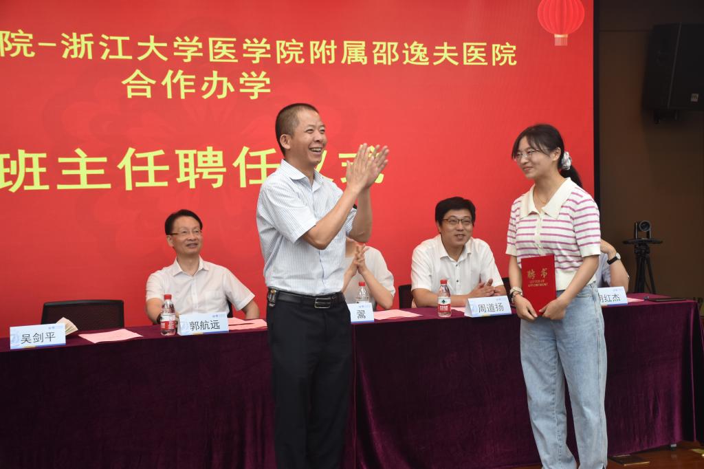 球盟会党委委员、学院经理郭航远与邵逸夫医院副经理黄翯共同签署教学医院合作协议。球盟会党委副书记林国旗宣读了聘任唐梦晓老师为医学影像学专业201班班主任的聘任文件,球盟会党委书记吴剑平为唐梦晓老师颁发聘书。