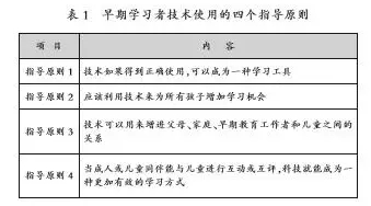 在对早期教育技术使用的关注层面,2016年10月发布的《早期教育与教育技术政策简报》阐述了一种技术支持学习的愿景,包括所有青少年在他们不同年龄阶段的学习过程中,都能从熟悉如何使用技术来辅助学习的大人那里获得支持;所有青少年都将有机会通过多种途径进行学习、探索、玩耍和交流,其中包括技术的使用。该《简报》为早期学习者提供了四个技术使用的指导原则,具体如表1所示: