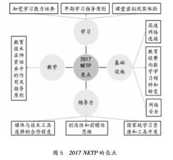 尽管2017 NETP是在2016年的基础上局部范围的更新,但还是体现了强烈的时代感,代表了技术在教育领域今后的发展趋势。与上一年NETP相比,2017 NETP在评价方面并没有做出新的修改和变动,而是在其他四个方面进行了小范围的更新和修正。2017 NETP呈现出了以下一些新的亮点(见图5):