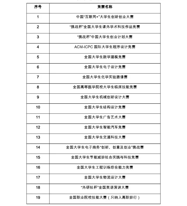 本次评估纳入的竞赛名称一览表