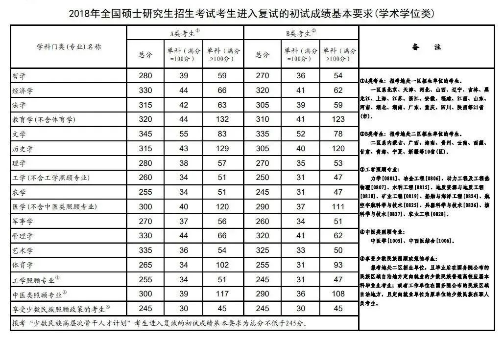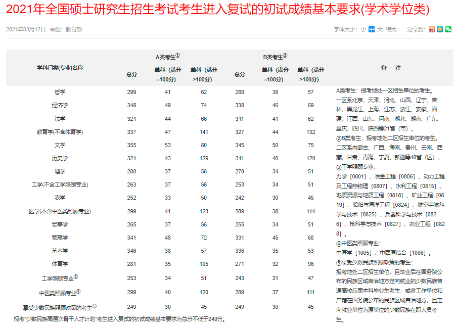 全国硕士研究生招生考试考生进入复试的初试成绩基本要求(学术学位类)(2017-2021年)