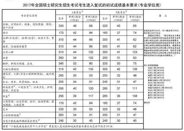 全国硕士研究生招生考试考生进入复试的初试成绩基本要求(专业学位类)(2017-2021年)