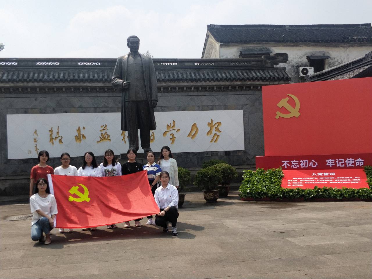 随后,两校实习生党员一同前往周恩来祖居开展党日活动,在周恩来铜像前,员工党员们在党旗前,高举右拳,重温入党誓词,庄严宣誓。重温入党誓词后,大家怀着崇敬的心情参观周恩来祖居。