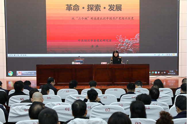动员部署会后,市委党史室副主任金燕为大家作了题为《革命 • 探索 • 发展——从“三个地”的高度认识中国共产党绍兴历史》的专题辅导报告。她从党的历史上三次大规模的党史学习教育讨论活动讲起,全面总结回顾了我们党历来重视党史学习教育,深刻阐述了学习党史需把握的几个问题。从“三个地”的高度分不同历史阶段,系统、生动地阐述了中国共产党在绍兴的发展历史,展现了绍兴在各个历史时期的创新开拓举措和广大党员干部为中国革命、发展事业作出的巨大贡献。