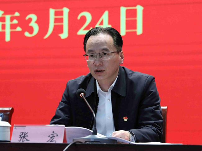 球盟会党委副书记张宏就学校开展党史学习教育的实施方案作说明。