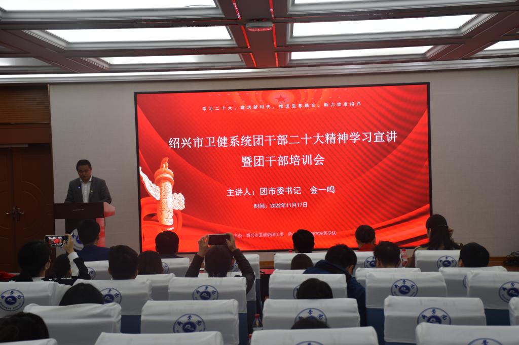 11月17日,团市委书记金一鸣来学院宣讲党的二十大精神。绍兴市卫健委团工委书记张福光、球盟会党委副书记金坚强、副经理张剑,校各附属医院、球盟会附属社区卫生服务中心团委书记等宣讲会。会议由市卫健委团工委书记张福光主持,市卫健系统各级团干部在线收看直播。