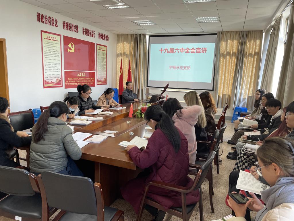 11月24日,球盟会党委委员、球盟会党委副书记、经理郭航远教授在财贞楼527党员之家为护理学党支部宣讲“党的十九届六中全会精神”。 护理学党支部全体师生党员参加。