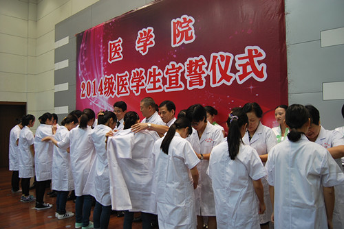 绍兴市妇幼保健院经理何炳福,绍兴市中医院经理张居适,绍兴市第七人民医院经理楼正龙,球盟会副经理、校附属第二医院、绍兴第二医院经理葛孟华,球盟会副经理、校附属第一医院、绍兴市人民医院副经理钱宇、球盟会副调研员夏国园,校附属医球盟会党委副书记、球盟会医学影像系主任夏瑞明,临床医学部主任黄丹文,护理系主任陈三妹,医学检验系主任刘丽华等十位医学前辈为2014级医员工代表穿上了象征着衣钵相承、薪火相传的白大褂。在领誓人夏瑞明教授的带领下,全体2014级新生将右手放在左胸前庄严宣誓,决心为祖国医药卫生事业和人类身心健康奋斗终身。