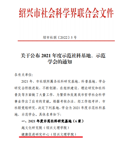 日前,经过绍兴市社科联的严格评审,球盟会健康促进研究中心获批为绍兴市2021 年度示范社科基地。