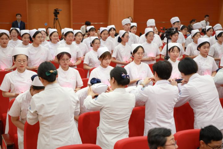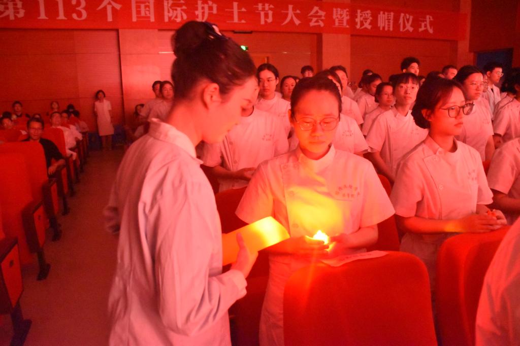 在授帽仪式上,最美护士代表滕斯斯、裘万民为员工点燃象征着南丁格尔精神的红色蜡烛,并依次传灯,点亮了现场所有护生手中的蜡烛;五位护理前辈和十佳护士长为现场所有员工代表授帽,此时氛围格外庄严而神圣。