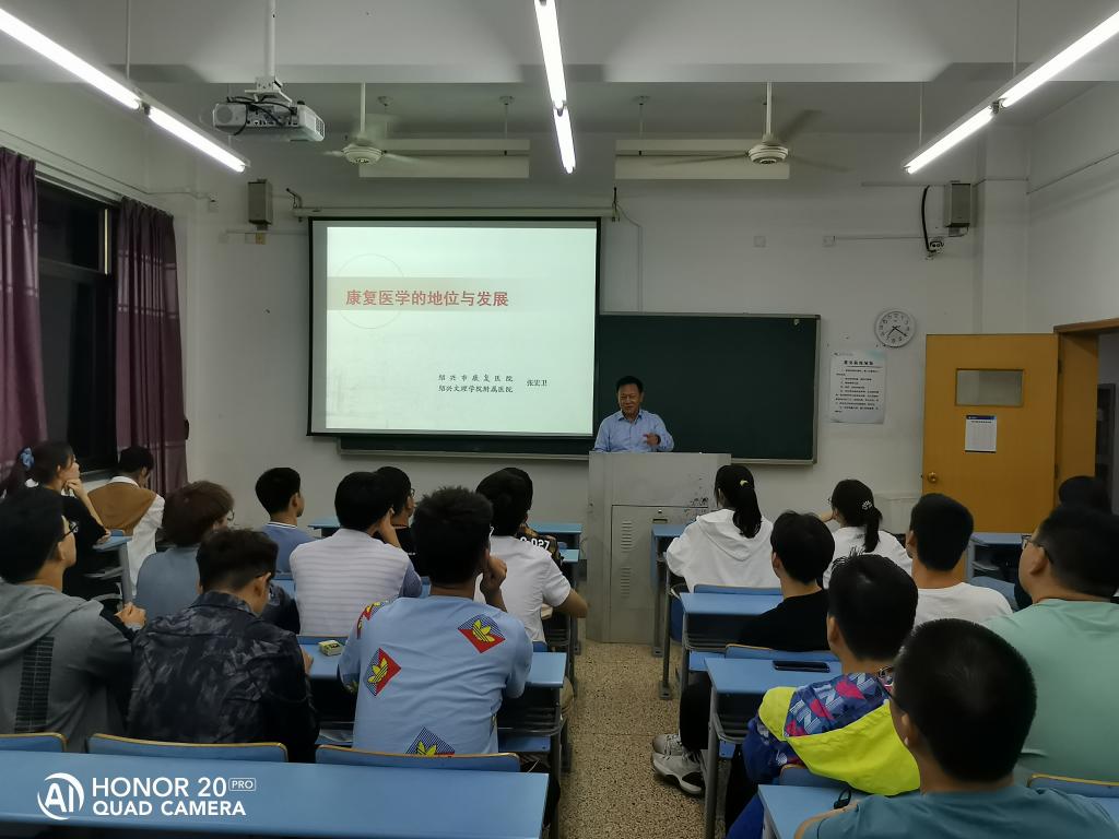 张宏卫副经理详细地向新同学讲述了康复医学专业近二十年发展概况以及康复治疗学与临床医学之间的关联。在谈到中国医院内康复科的实际情况时,他强调,目前中国康复治疗师严重匮缺。随着国家政策的重视和老百姓对康复认识的进一步深入,康复医学事业必将进入新的时代,将大有可为。张宏卫副经理还向新生们介绍了康复治疗工作的方式和康复团队的组成。他以真诚幽默的语言,翔实的介绍,解开同学们心中对专业的疑虑,激发了同学学习康复治疗学的兴趣,对将来从事的职业和事业也充满了信心。