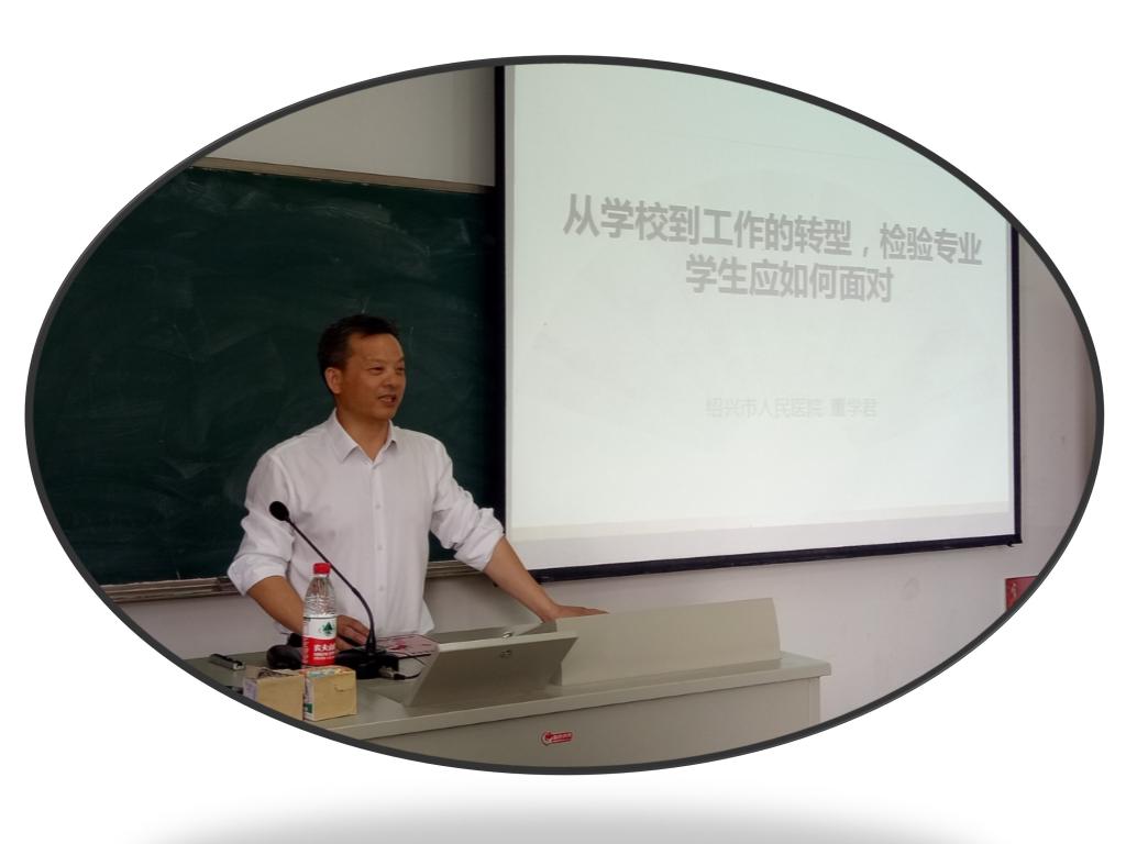 5月16日上午,绍兴市人民医院临床检验中心主任董学君教授受邀来我系作专题报告,题目是《从学校到工作的转型,检验专业员工应如何面对》。这次活动是医学检验技术专业员工进入临床实习前的一个重要教育环节,医检161班全体员工以及部分教师参与本次活动。