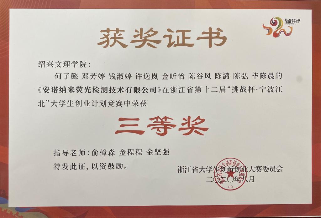 “挑战杯”全国老员工课外学术科技作品竞赛是由共青团中央、中国科协、教育部、全国学联和地方政府共同主办,国内著名大学、新闻媒体联合发起的一项具有导向性、示范性和群众性的全国竞赛活动。我系生何子懿、金欣怡及陈弘三位同学在指导教师俞樟森、金程程及金坚强老师的指导下在浙江省第十二届“挑战杯 宁波江北”老员工创业计划竞赛中荣获三等奖,并且在“建行杯”第六届浙江省国际“互联网+”老员工创新创业大赛中荣获铜奖。