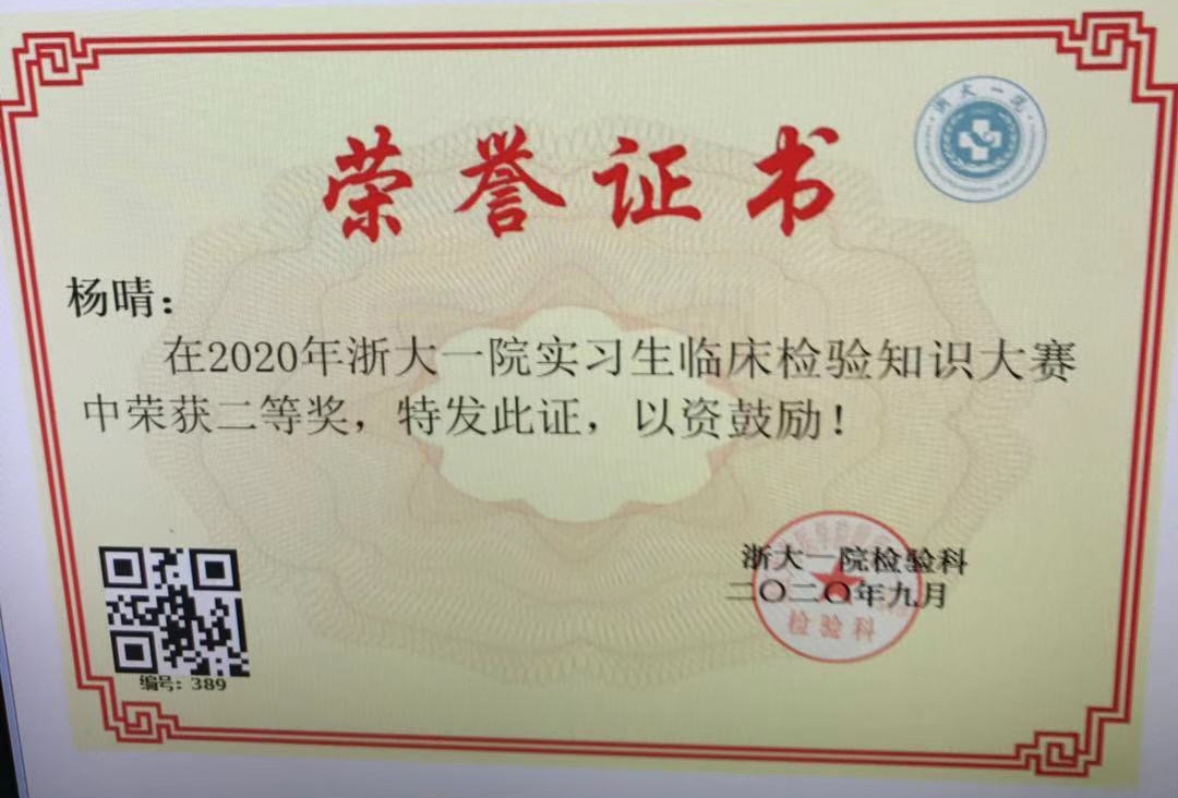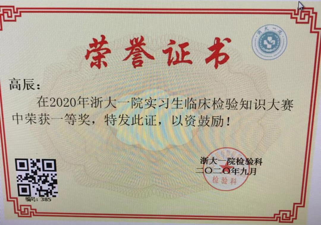 浙大一院为积极响应2020年浙江省临床检验技能竞赛,并强化实习生队伍建设,检验科成员认真筹备此项大赛相关工作;本次大赛按照考试成绩对所有参赛实习生进行排名,其中设置一等奖3名、二等奖6名、三等奖10名。我系同学在所有实习生中,成绩位列前茅,包揽一等奖名额。