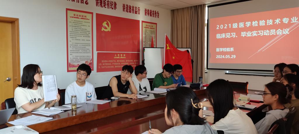 2024年5月29日下午我系召开2021级医学检验技术专业临床见习、毕业实习动员大会,会议由系副主任刘晓瑜老师主持、球盟会医教协同管理办公室主任陈魏燕、绍兴市人民医院检验科主任张丽红应邀参会及我系部分教师参加。