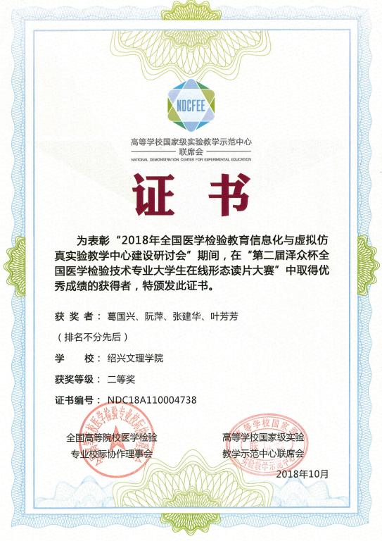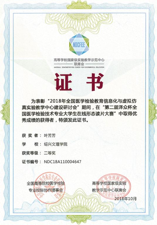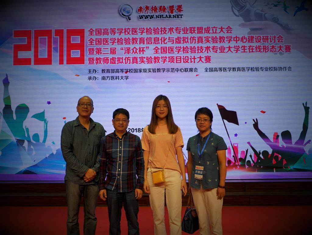 2018年10月11日至13日,由高等学校国家级实验教学示范中心联席会、全国高等医学教育医学检验专业校际协作会主办,南方医科大学承办的医学检验教育信息化与虚拟仿真中心建设研讨会在广州召开,会议期间,举办了第二届“泽众杯”全国医学检验技术专业老员工在线形态大赛,我系医学检验技术专业16级叶芳芳同学获得本科组个人二等奖,并获得参赛团队二等奖。