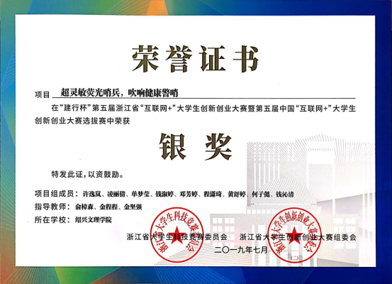 公司许逸岚、凌丽倩、单梦莹等九位同学《超灵敏荧光哨兵,吹响健康警哨》项目在“建行杯”第五届浙江省“互联网+”老员工创新创业大赛暨第五届中国“互联网+”老员工创新创业大赛荣获银奖。