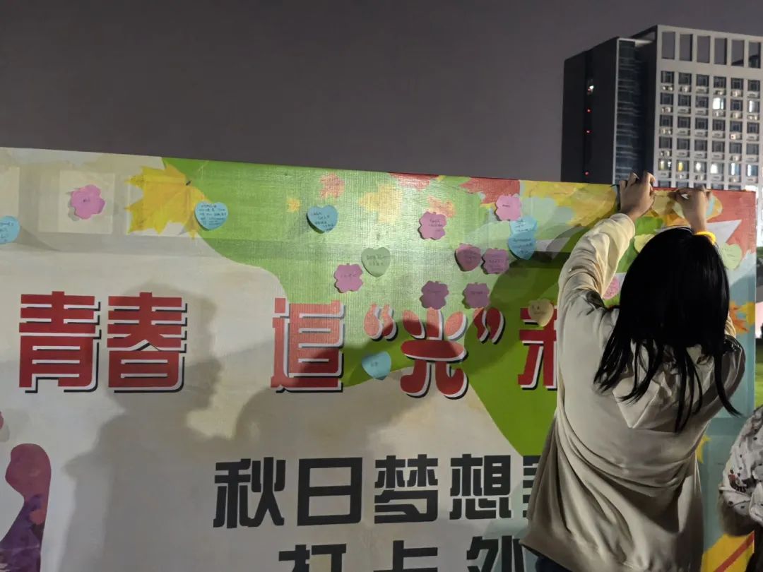 晚风徐来,桂香萦绕。操场上人潮涌动,青春满溢,谈笑欢欣。笔墨挥毫,一行行心愿祝福写在便签纸上,贴在“心愿墙”上,见证着彼此的寄语。
