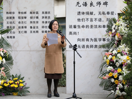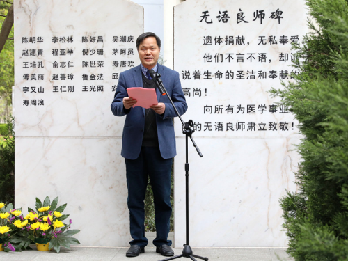 活动现场,员工代表向“无语良师”纪念碑敬献花篮,全体人员向捐献者们行三鞠躬。