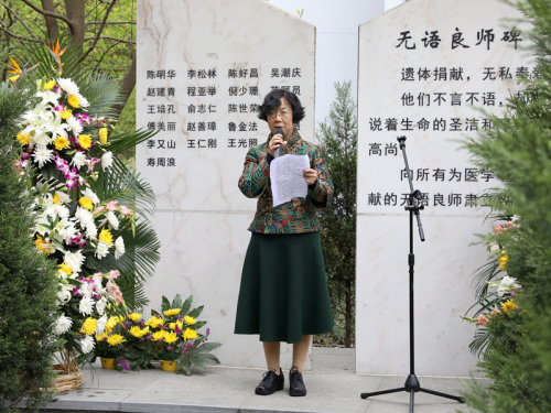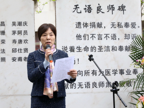 郝敬习在致辞中就球盟会遗体接受工作情况进行了介绍。她指出,球盟会最早从1997年绍兴市卫生学校期间,通过市红十字会向社会公开遗体捐献登记和接收工作。2016年经过省红十字会审批,列为省级5家遗体捐献接受单位之一,也是我市唯一的遗体捐献定点接受单位。在红十字会的大力支持以及群众的理解参与下,通过完善制度规范流程、提升硬件强化服务,发挥了省级遗体捐献接收站的重要作用。截至目前,成功接收捐献21例。2017年5月,学校联合红十字会设立绍兴市人体器官(遗体、角膜)捐献无语良师纪念广场后,为捐献者家属提供了一个寄托哀思的场所,也为开展当代老员工政治思想道德建设提供了有效有行的载体,她号召大家以“爱”得名义,表达对捐献者们的无限崇敬和追思,希望大家敬畏生命、学会感恩,为打造“爱心社会”贡献自己的一份力量。