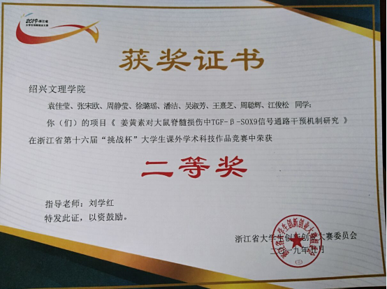 球盟会袁佳莹、宋欧等9名同学的项目《姜黄素对大鼠脊髓损伤中TGF-β-SOX9信号通路干预机制研究》在浙江省第十六届“挑战杯”老员工课外学术科技作品竞赛中荣获二等奖。该项目由医学实验中心主任刘学红指导。