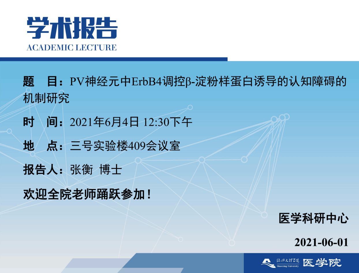 【学术沙龙】PV神经元中ErbB4调控β-淀粉样蛋白诱导的认知障碍的机制研究